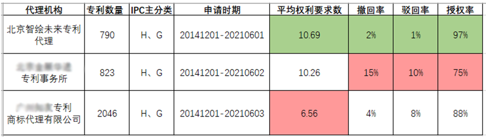事务所成立四年多,事务所在市场营销成本为零的情况下,客户数量和专利申请代理量均快速增长,同时,稳步提升专利代理质量。以下表格为某审查协作中心在某课题分析中所引用的我事务所的专利授权率及权利要求平均数的情况,其中H/G大类专利授权率位列所有专利代理机构之首,(注:H、G为国际专利分类体系8大类中的其中两类,G大类为物理大类,包含仪器、核物理;H大类为电学大类,包含电气、电子、计算机、半导体、通信等)